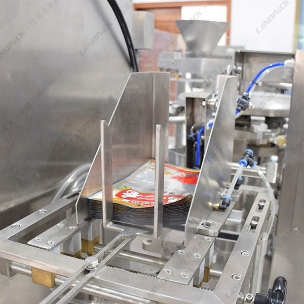 工作流程: 上袋→打印生產(chǎn)日期→開袋→充填1→充填2→空位→熱封→整形及輸出