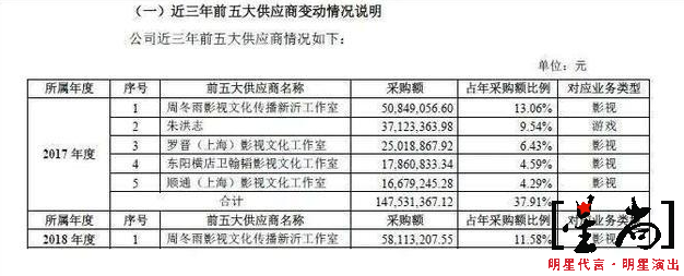 明星代言近日,浙江衛(wèi)視總編室原主任陶燕受賄案鬧得風(fēng)風(fēng)火火。本來法院對此案做出判決就算是塵埃落定了,沒想到還牽扯出了周冬雨和羅晉。鼎龍文化公布的年報中顯示,周冬雨工作室和羅晉工作室在2017和2018年度的前五大供應(yīng)商分別占據(jù)了一個席位。兩個工作室的采購金額分別為1.09億元(周冬雨)和7714.14萬元(羅晉)。截至目前,周冬雨、羅晉本人及其工作室并未作出回應(yīng)。
