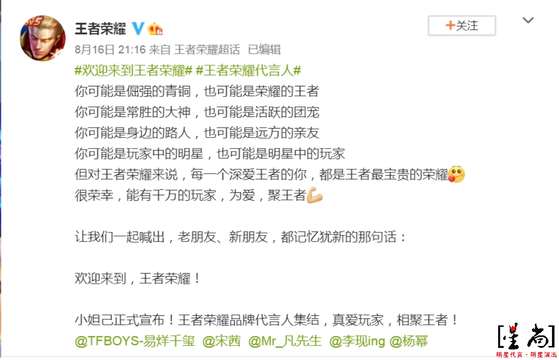 明星代言8月16日晚間,王者榮耀官方微博宣布易烊千璽、宋茜、吳亦凡、李現(xiàn)、楊冪成為手游王者榮耀的品牌代言人。